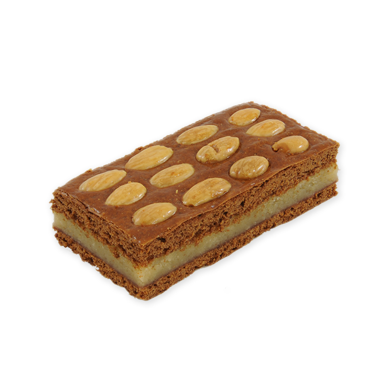 Gevuld speculaas met amandelspijs en afgewerkt met halve amandelen.