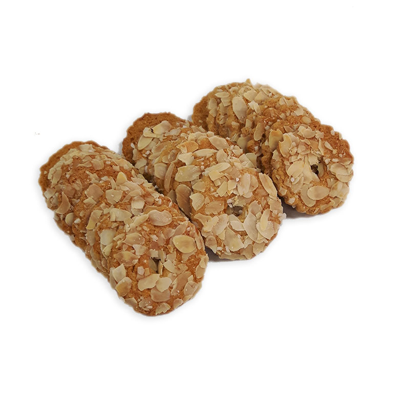 Krokante koekjes met amandelschaafsel en suiker.