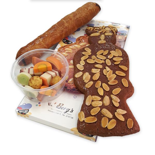 Sinterklaas pakket bestaande uit: Roomboter amandelstaaf, speculaaspop klein, marsepein winterkost. Verpakt in een sint tasje!