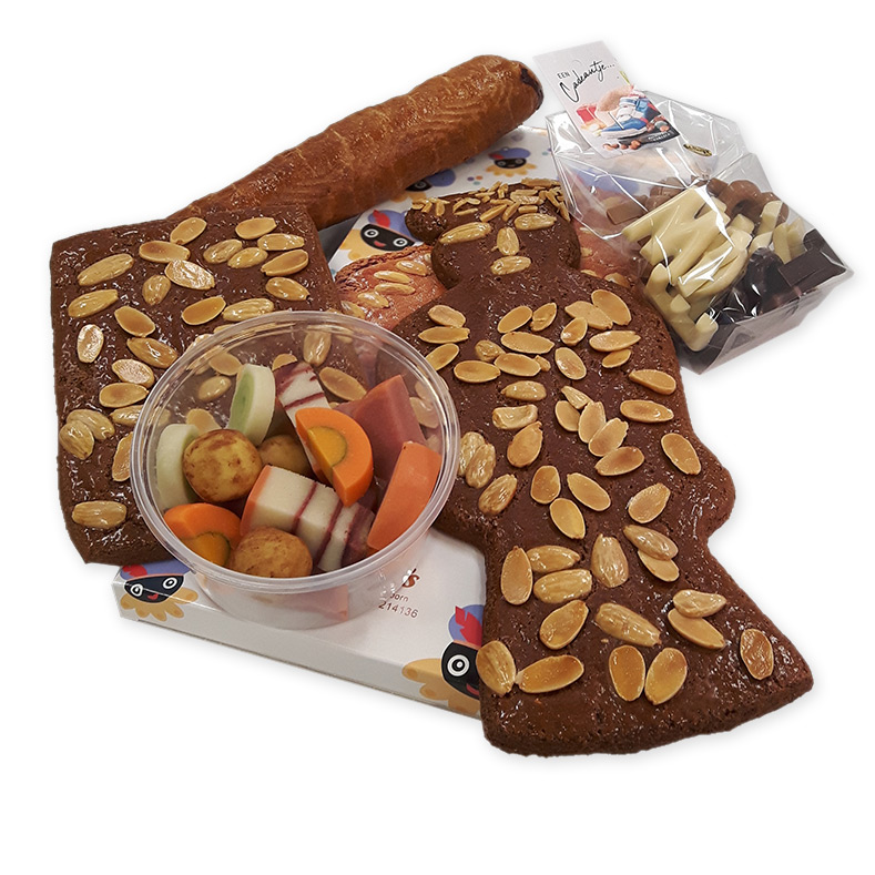 Sinterklaas pakket bestaande uit: Roomboter amandelstaaf, speculaaspop klein, marsepein winterkost, zakje mini chocolade lettertjes, speculaasbrok.